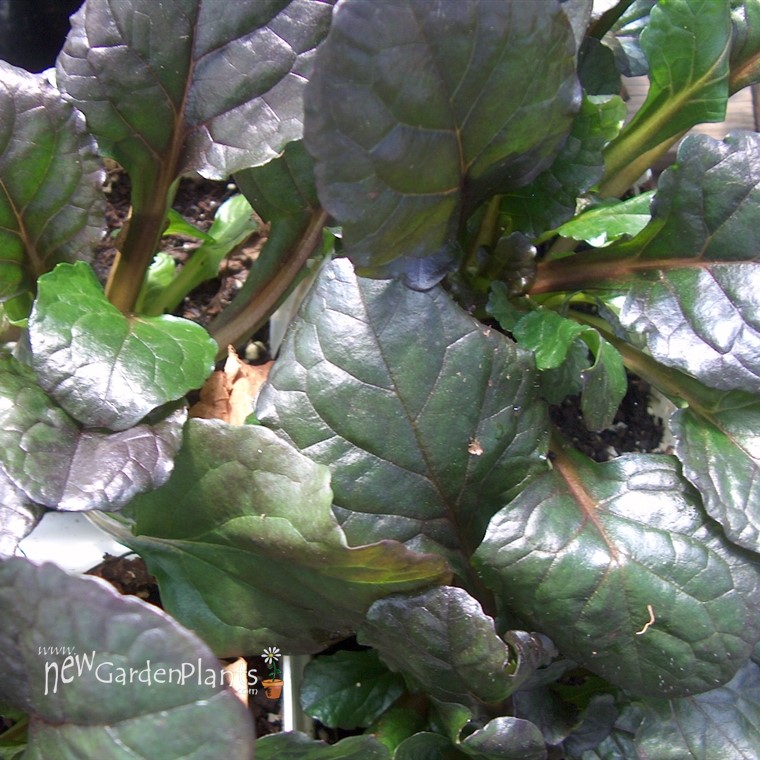 Larger leafed ajuga w/ purple and green foliage with a ruffled edge