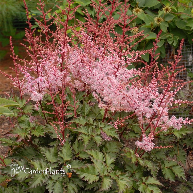 Red stems produce salmon red buds that open to a gorgeous soft apricot pink