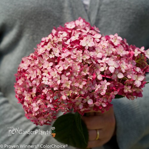 Dark burgundy red flower buds of Invincibelle Ruby open to a two-toned combination of bright ruby red and silvery pink