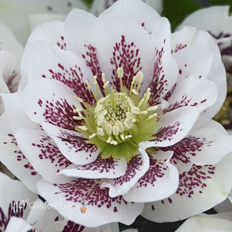 'Confetti Cake' has 2.5-3" double white flowers with burgundy speckling concentrated toward the center of the petals