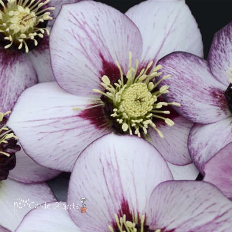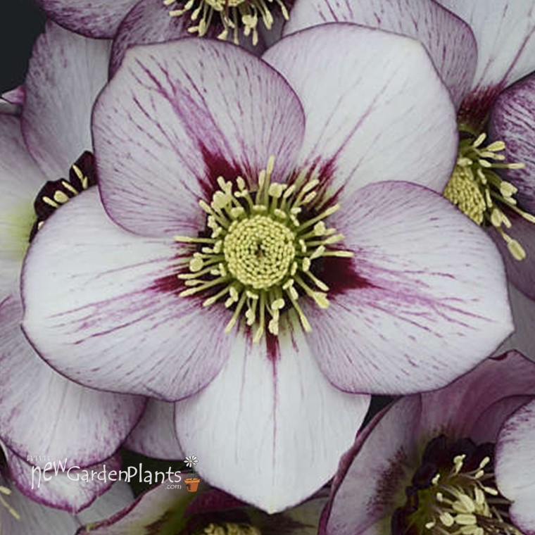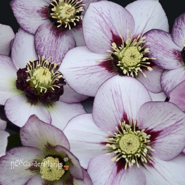 Helleborus 'French Kiss' has 3-3.5”, single white flowers lined with raspberry pink that veins in toward the center of the petals