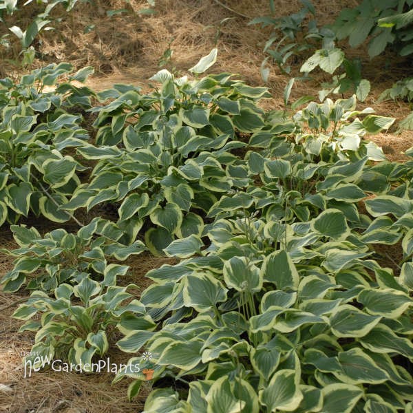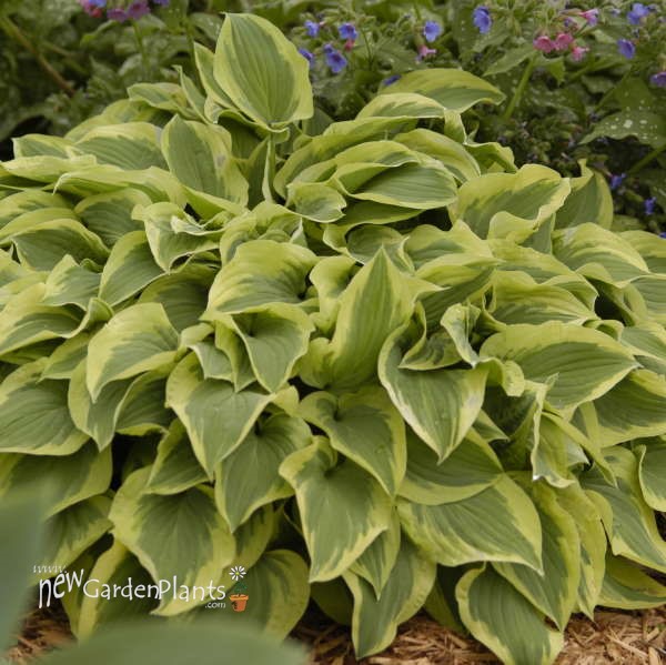 Heart-shaped, light gray-green leaves have wide, creamy yellow margins which become creamy-white by early summer