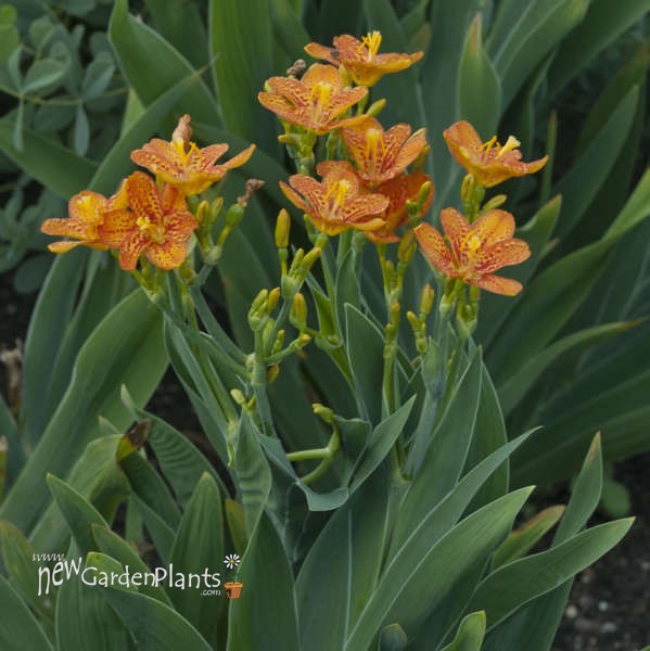 This unique perennial produces a profusion of two inch wide, brilliant orange blossoms with heavy red specking and shading on each of the six overlapping petals. They are produced atop mid-sized plants with green, sword-shaped foliage like that of a tall bearded iris.