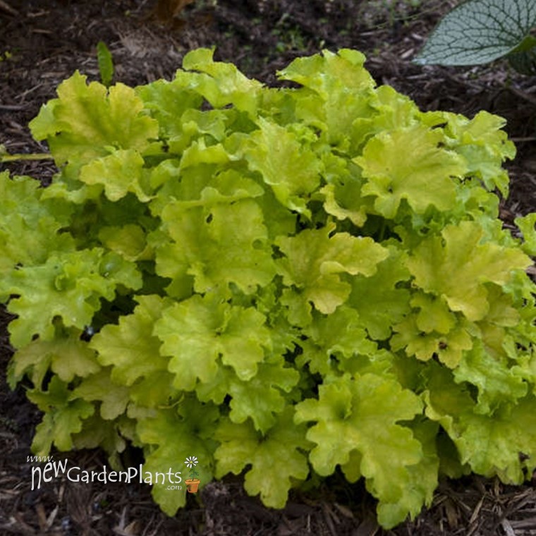 Chartreuse yellow leaves have wavy, rippled edges that will mature to apple green leaves later in the season