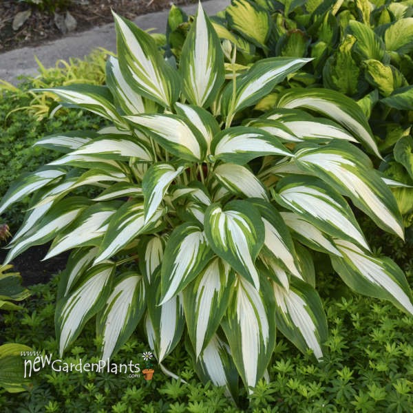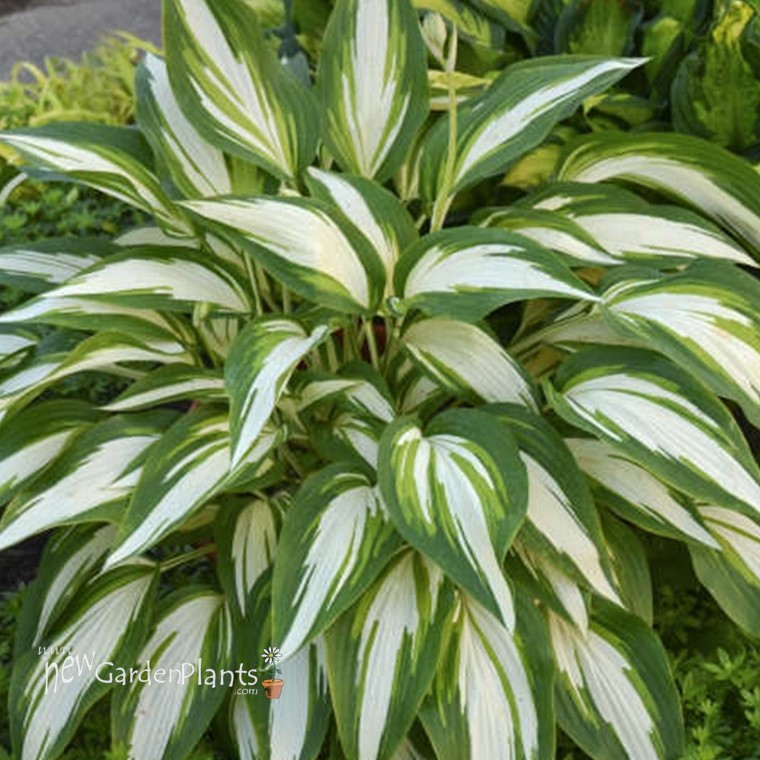 This gorgeous large hosta forms an incredibly showy, cascading clump of green and white variegated foliage