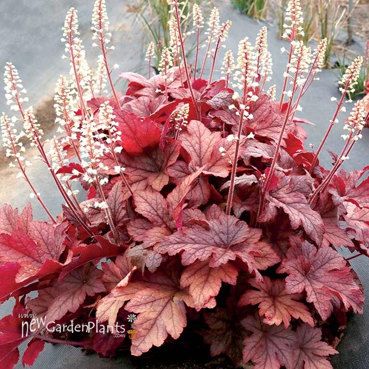 Large, peachy-red leaves contrast beautifully with cream white flowers