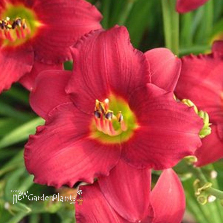 Miniature cranberry red flowers w/ narrow yellow watermark and green throat
