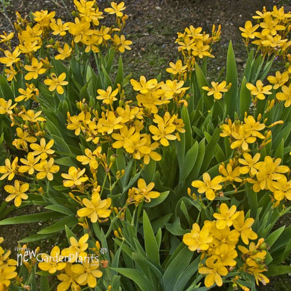 A profusion of bright yellow, star-shaped flowers are produced above a compact clump of green, sword-shaped foliage