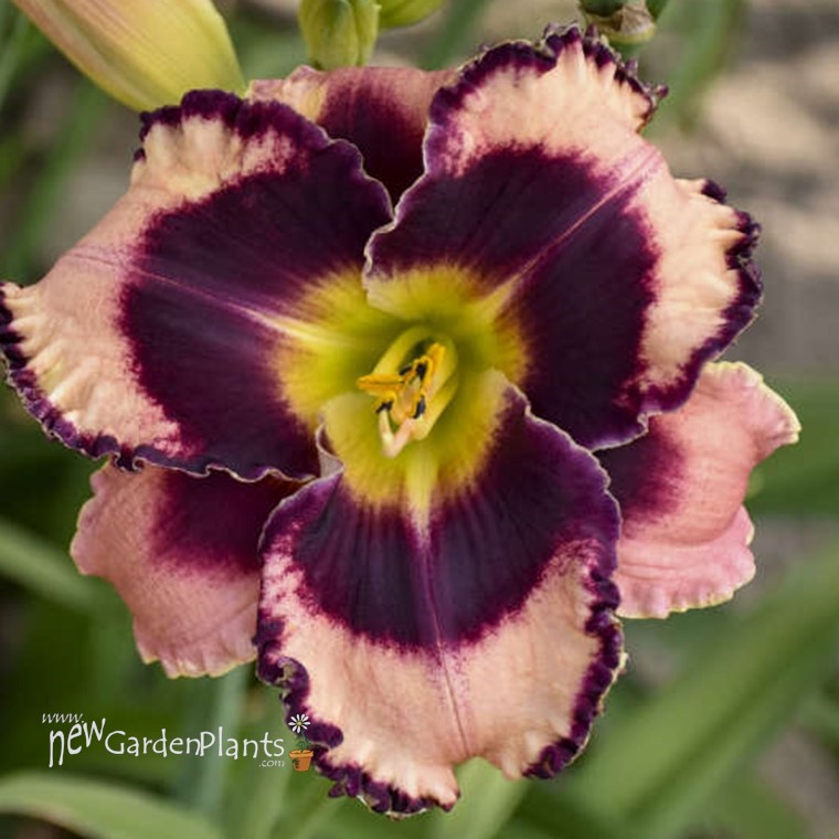 Light mauve flowers have an extremely wide, dark purple eye and a matching dark purple picotee edge