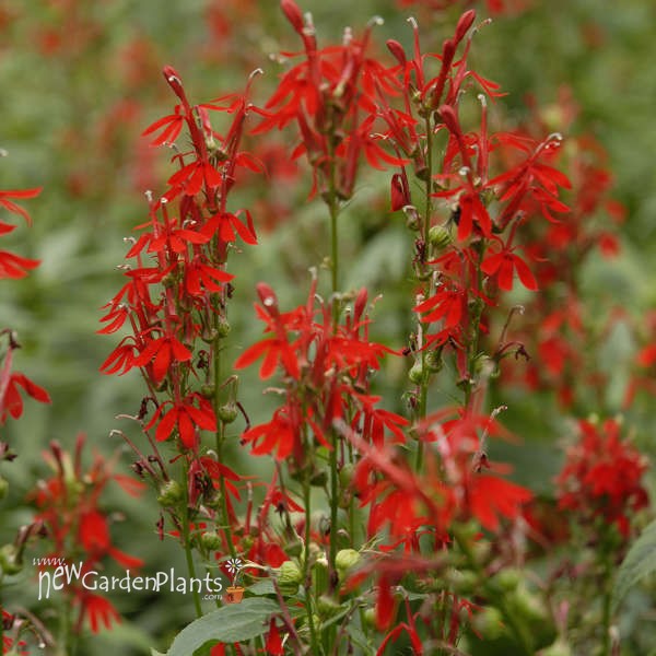 Brilliant fire red flower spikes stand atop distinctly upright plants from late summer through early fall