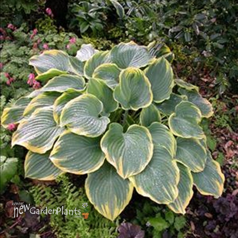 Huge, wavy, frosted grey-green leaves w/ yellow to creamy white margins Lavender flowers Award winner 2000 Hosta of the year Watanabe (1985) [large]