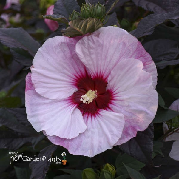 ‘Perfect Storm’ has huge, 7-8” wide, white flowers with a bright red eye that radiates out the veins, with the petals edged with pink