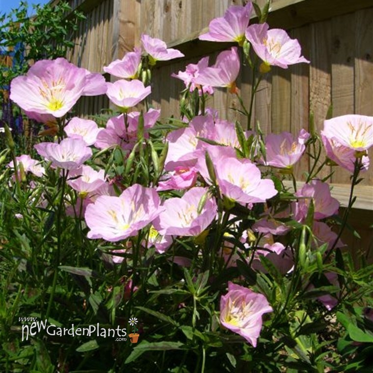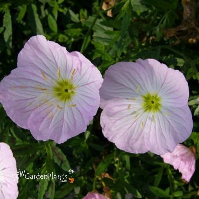 Oenothera b. Twilight is an upright, herbaceous perennial that has mid-green foliage with a distinctive purple-bronze central marking, most pronounced in young growth
