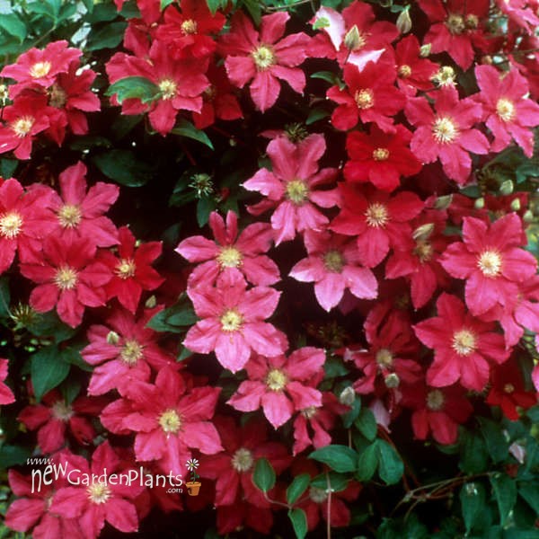 'Ernest Markham' Clematis produces vibrant magenta-red flowers with a frilly center of golden anthers on fast-growing vines