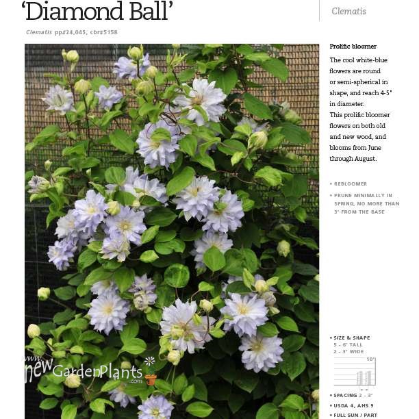 'Diamond Ball' clematis is a prolific bloomer with blooms appearing from June through August on old and new wood