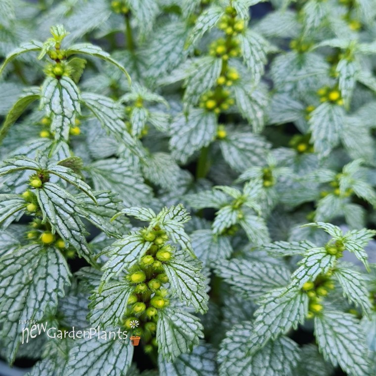 Forms a dense mound of metallic silver foliage with green veins, then proceeds to spread and fill in