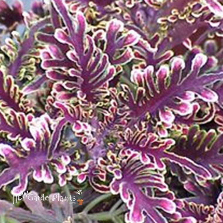 Very distinctive slender burgundy fern-shaped leaves, edged with gold ruffles