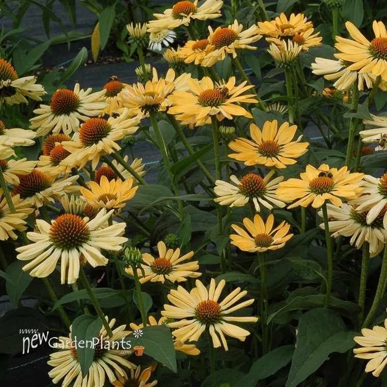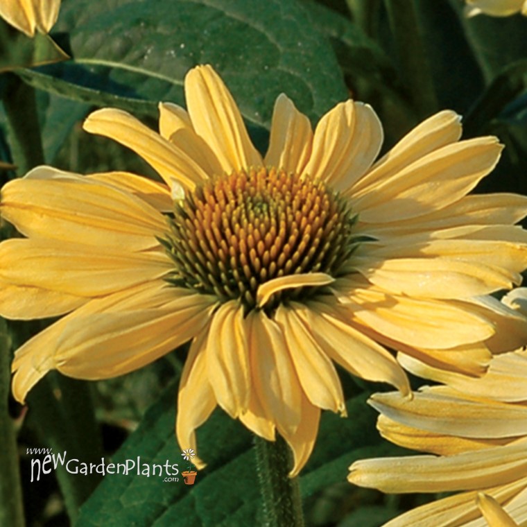 Wide, melon yellow petals surround orange cones