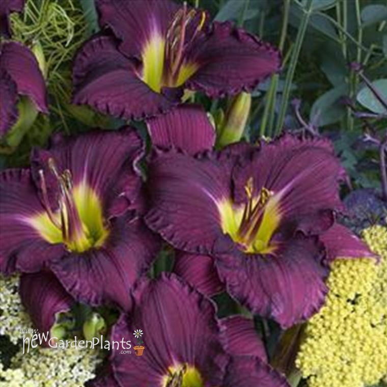 Dark purple very sunfast blooms w/ chartreuse throat and ruffled petals